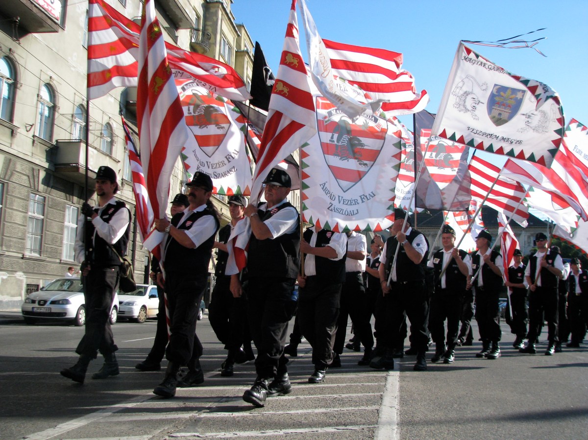 4 January 7, 2015 3264 × 2448 Hungarian Guard marching with Árpád-striped and other flags during protest of the 1920 Treaty of Trianon (6/13/2009).