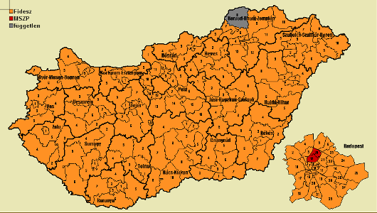 Candidates from the Fidesz-KDNP alliance defeated opposition rivals in 173 of 176 individual electoral-districts in Hungary. Hungarian Socialist Party candidates were victorious in two individual electoral-districts in the country—both of them located in the traditionally working-class Angyalföld district in the northern section of the Pest side of Budapest. A Jobbik-supported independent candidate won the remaining individual electoral-district located in northeastern Hungary.