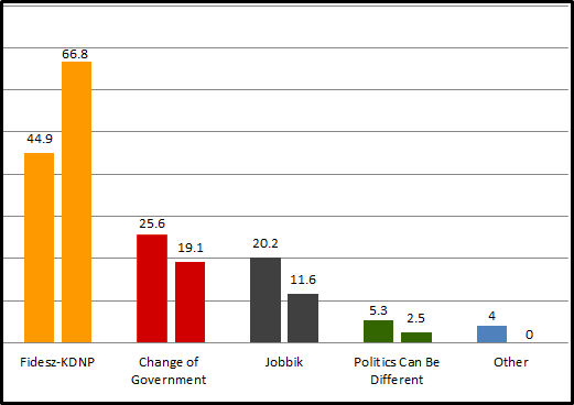 The Fidesz-KDNP alliance therefore won 66.8 percent of the seats in the National Assembly on 44.9 percent of the party-list votes, while Change of Government won 19.1 percent of the seats on 25.6 percent of the party-list votes, Jobbik won 11.6 percent of the seats on 20.2 percent of the party-list votes and Politics Can Be Different won 2.5 percent of the seats on 5.3 percent of the party-list votes.