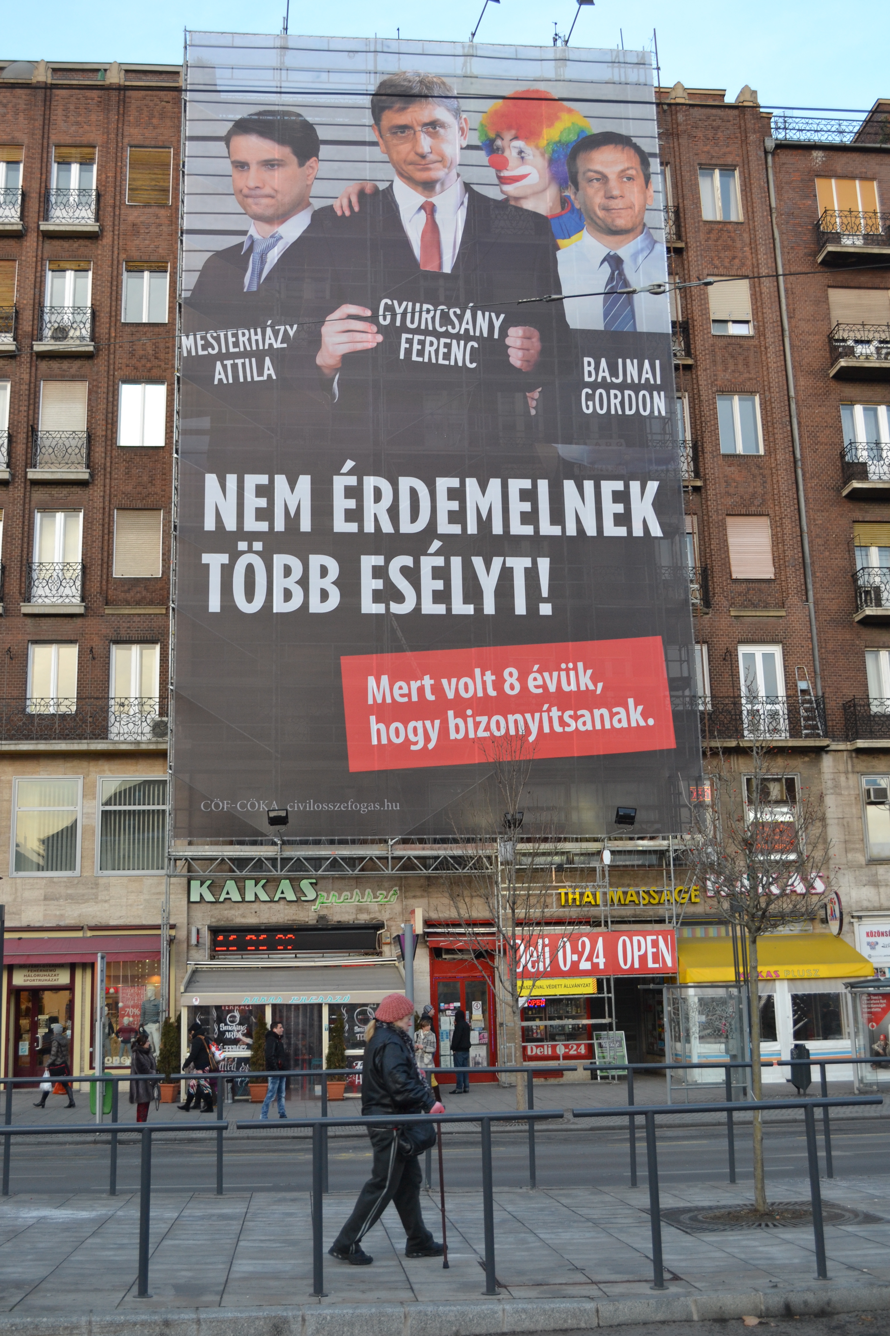 Following the establishment of the Cooperation (Összefogás) opposition-party coalition in the middle of January, the pro-Fidesz organization Civil Cooperation Forum (Civil Összefogás Fórum, or CÖF) placed signs like the above throughout Budapest, including a colossal sign in the middle of the city.