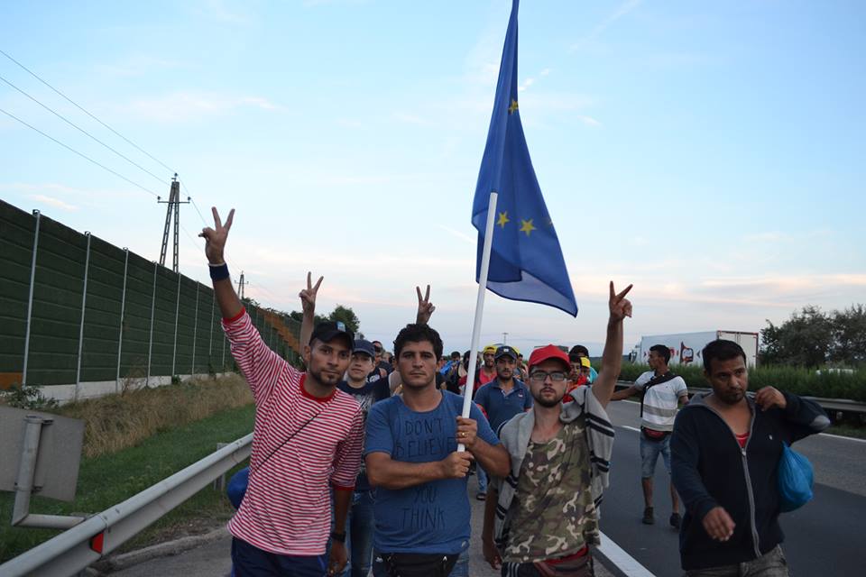 11951100_10206562162906481_7983746966339683611_n[1] September 10, 2015 960 × 640 in Hungary and the Great Migration Syrians walking down the M1 highway toward Austria (photo: Orange Files).