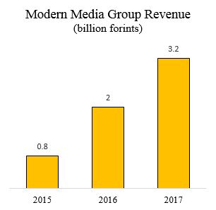 Modern Media Group generated revenue of 3.2 billion forints in 2017, up from 2 billion forints in 2016 and 800 million forints in 2015 (sources A, B and C in Hungarian).
