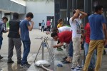 A few late-night stragglers observe the spectacle from a distance. A couple of them take video on their mobile phones.