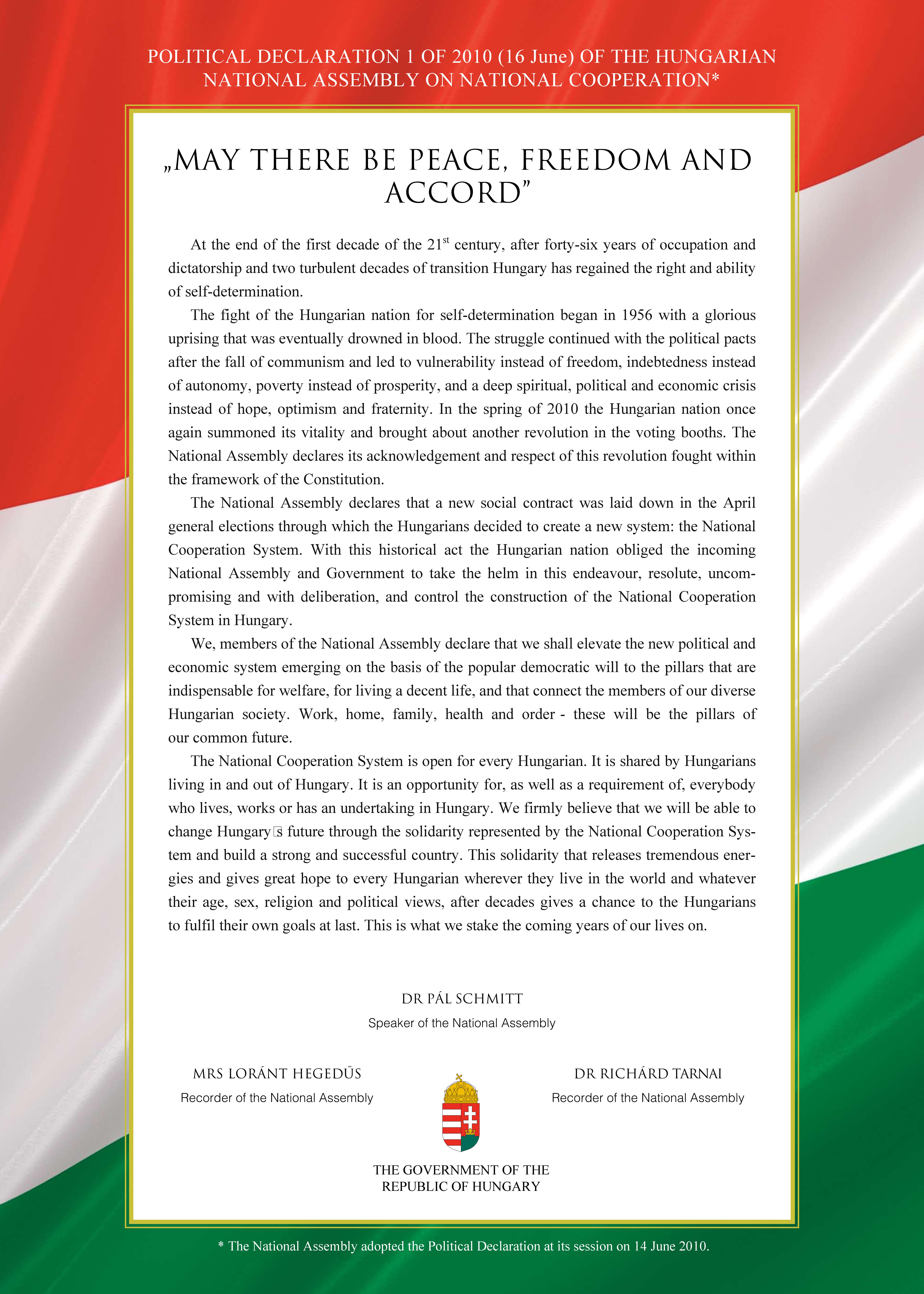 On June 14, 2010, Fidesz–Christian Democratic People’s Party (KDNP) National Assembly representatives approved the Declaration of National Cooperation (Nemzeti Együttműködés Nyilatkozata) one month after the newly elected legislature’s founding session (source in Hungarian).