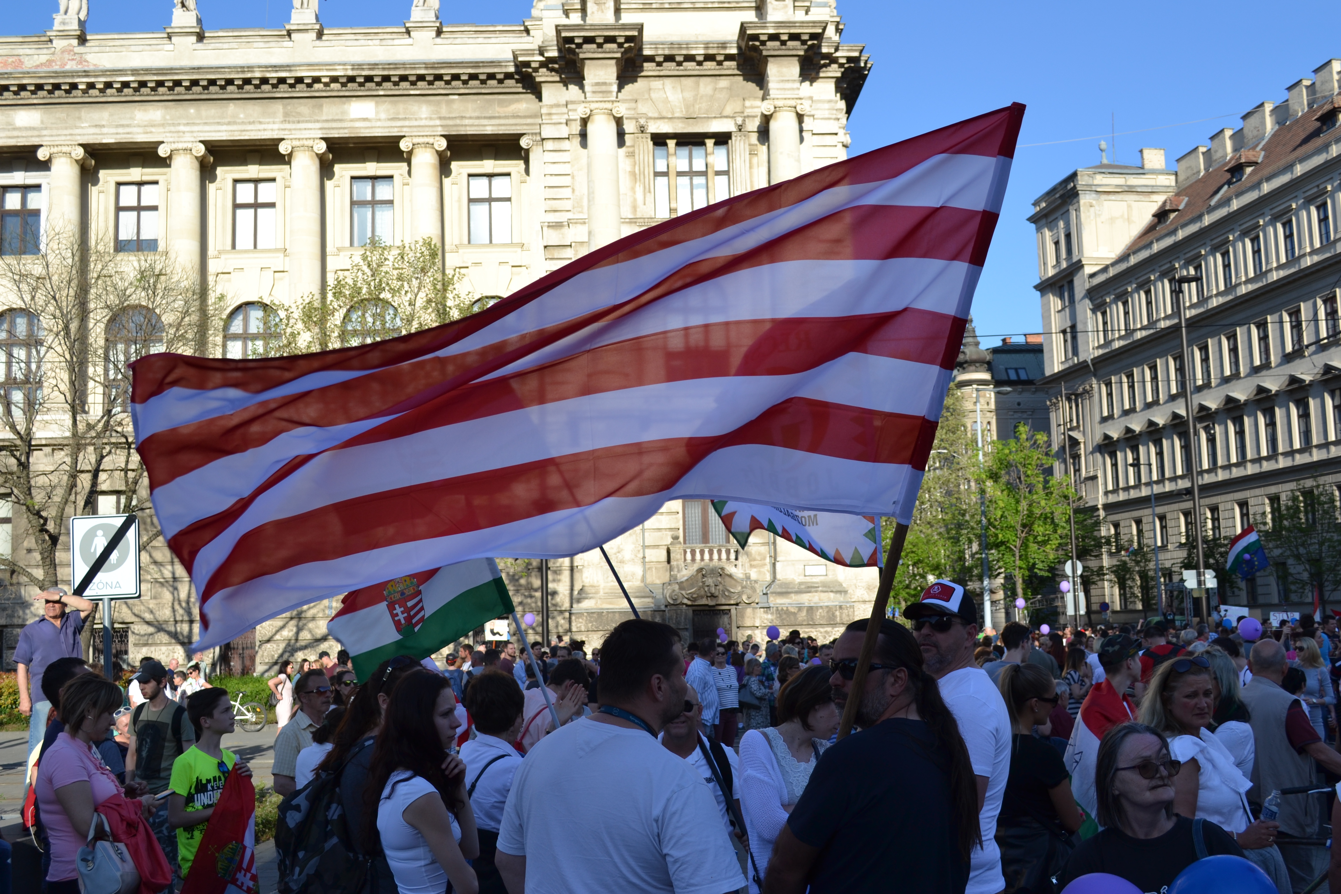 Demonstrators with nationalist Árpád-striped flag.