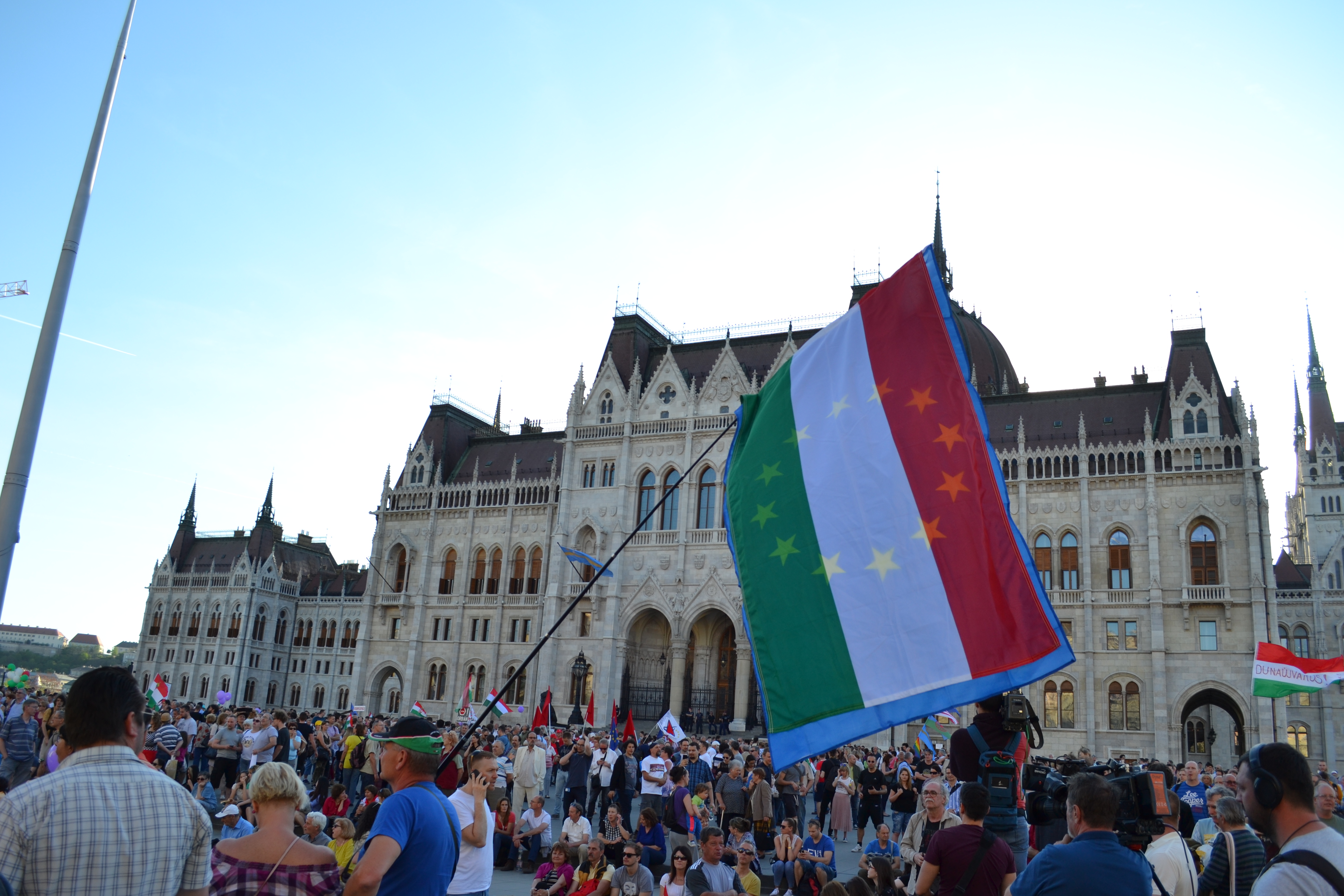 DSC_0041 April 22, 2018 4608 × 3072 Demonstrator with Hungarian national flag and European Union flag together.