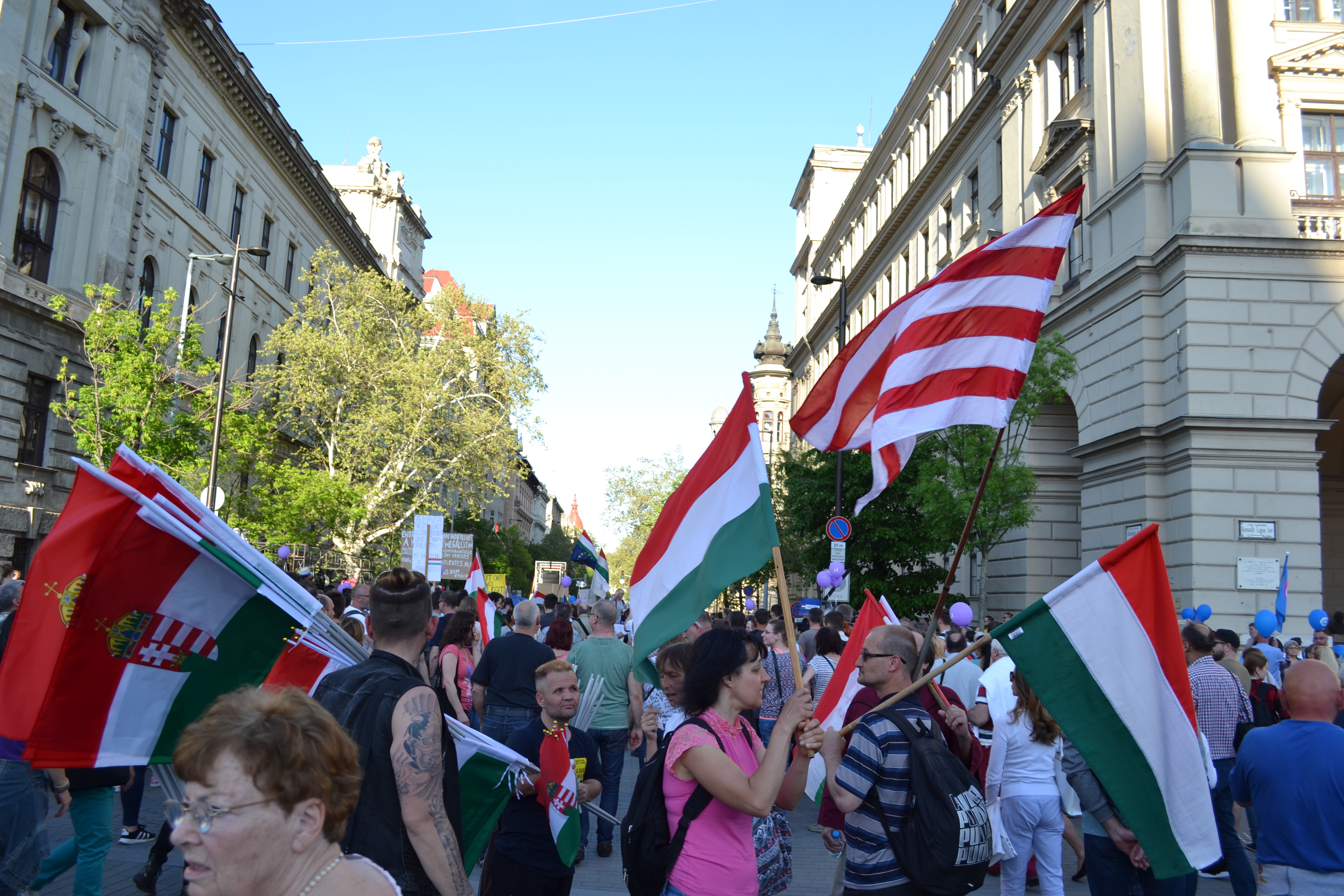 DSC_0042 April 22, 2018 4608 × 3072 Demonstrators with Hungarian flags and nationalist Árpád-striped flag.