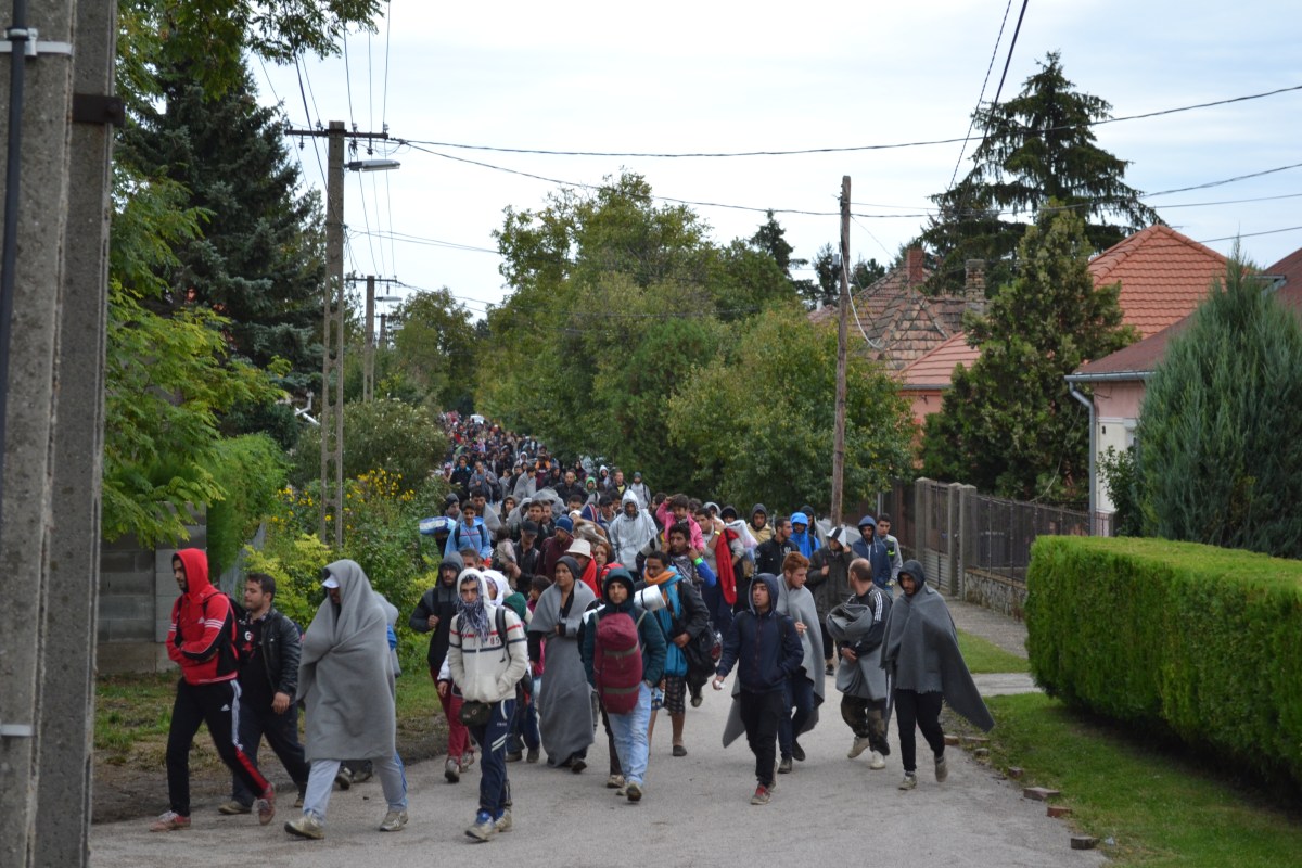 Migrants walk through village of Hegyeshalom.