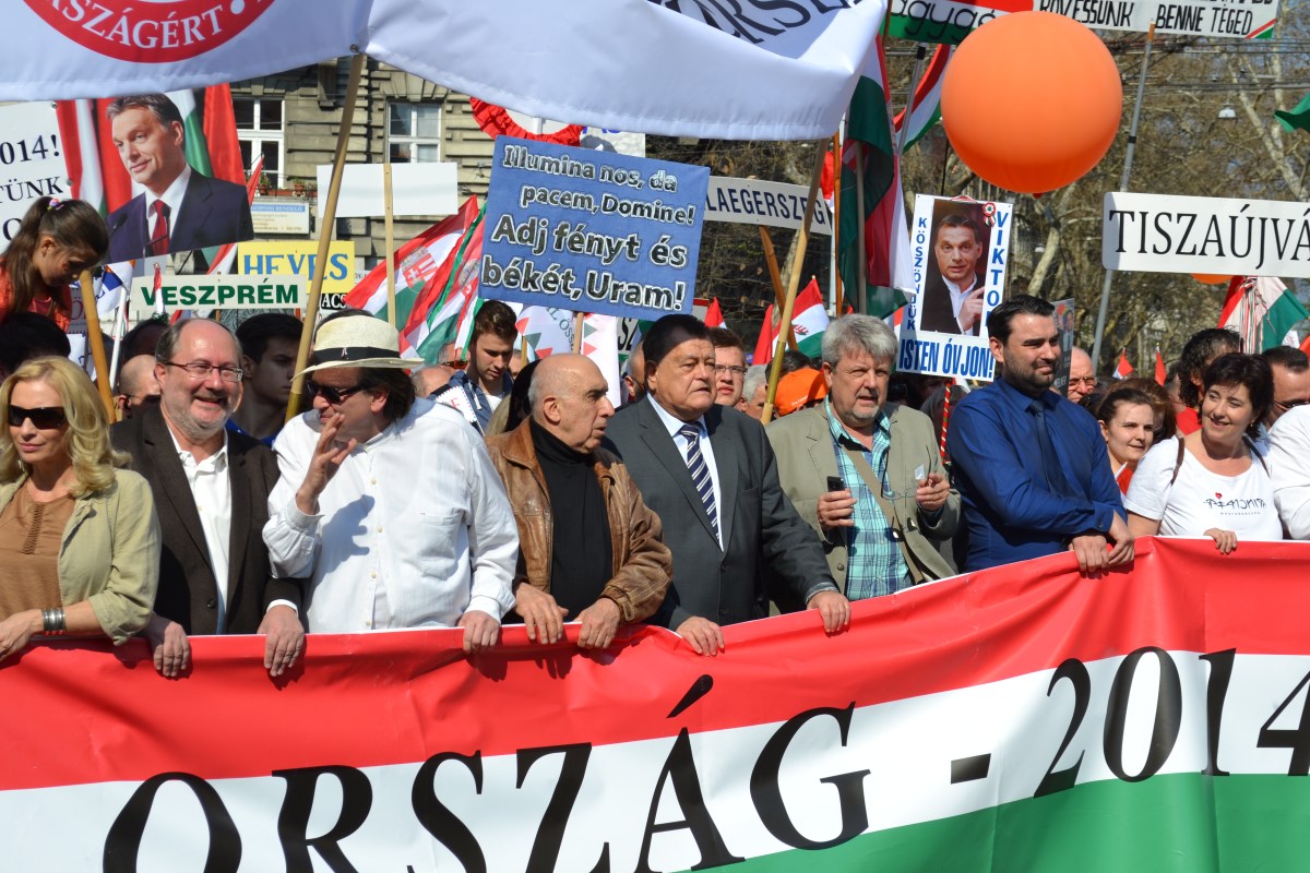 DSC_0658 March 30, 2014 4608 × 3072 Peace March organizers: István Sefka (second from left), Gábor Széles (center) and László Csizmadia (second from right).