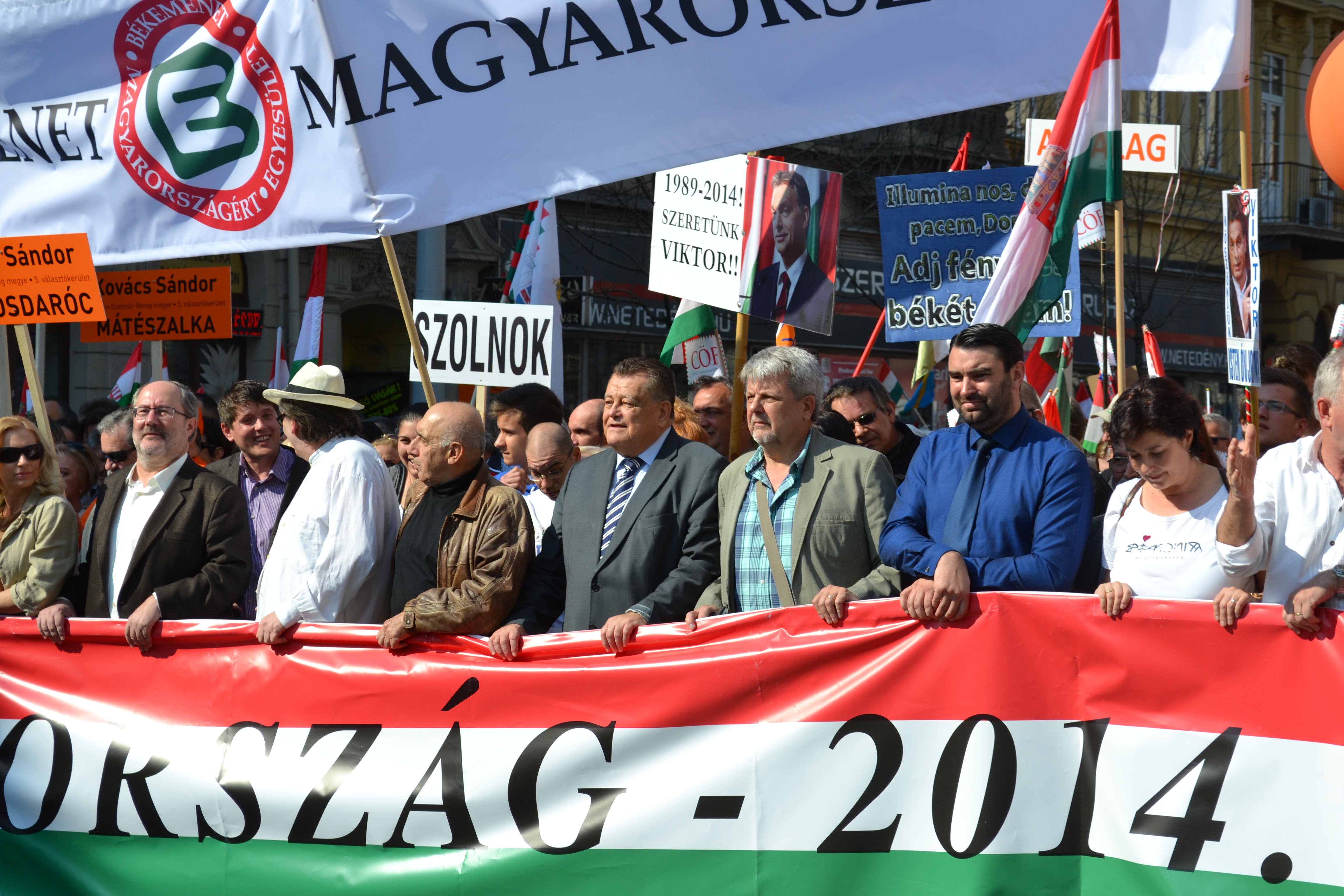 DSC_0663 March 30, 2014 4608 × 3072 Peace March organizers: István Sefka (second from left), Gábor Széles (center) and László Csizmadia (second from right).