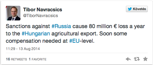 On August 7, 2014, Russia imposed an immediate ban the import of fruit, vegetables, meat, fish and dairy products from the United States, Norway, Canada, Australia and European Union member states, including Hungary, in retaliation for sanctions that these countries had imposed on Russia to penalize the country for its military interventions in Ukraine earlier in the year (source in English). On August 13, Orbán government Minister of External Economy and Foreign Affairs Tibor Navracsics posted the following tweet on his Twitter account: