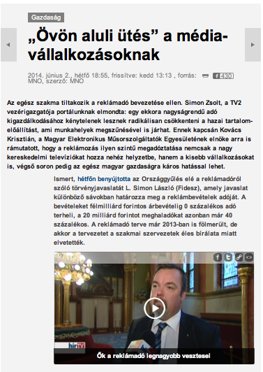 On June 11, 2014, the National Assembly adopted a government-initiated tax on advertising revenue that significantly reduced the profits of Simicska’s television station Hír TV, newspaper Magyar Nemzet, radio stations Lánchíd Rádió and Class FM and advertising companies Mahir Cityposter and Publimont (sources A and B in Hungarian).