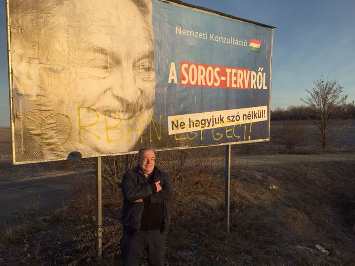 On November 28, 2017, Simicska spray-painted Orbán egy geci on three signs advertising the Orbán government’s “National Consultation on the Soros Plan” located alongside a highway running between Veszprém and Budapest (source in Hungarian).
