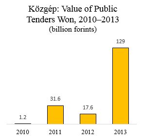 Közgép won 179.4 billion forints in public tenders from 2010 through 2013: 1.2 billion forints in 2010; 31.6 billion forints in 2011; 17.6 billion forints in 2012; and 129 billion forints in 2013 (source in Hungarian).