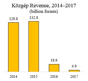 Közgép generated revenue of 4.9 billion forints in 2017, down from 19.9 billion forints in 2016, 132.8 billion forints in 2015 and 129.8 billion forints in 2014 (sources A and B in Hungarian).