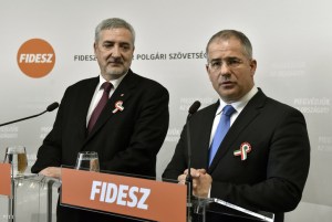 Outdoor-advertising bill sponsors János Halász (left) and Lajos Kósa discuss “Lex lackey” (photo: MTI).