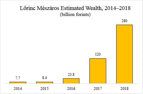 Lőrinc Mészáros was ranked the second-richest person in Hungary in 2018 behind OTP Bank Chairman-CEO Sándor Csányi with estimated wealth of 280 billion forints, or slightly more than 905 million euros at the average 2017 exchange rate (source in Hungarian). Mészáros has generated an exponential increase in wealth since he first appeared on the annual napi.hu list of the 100 richest Hungarians in 2014 (see table below).