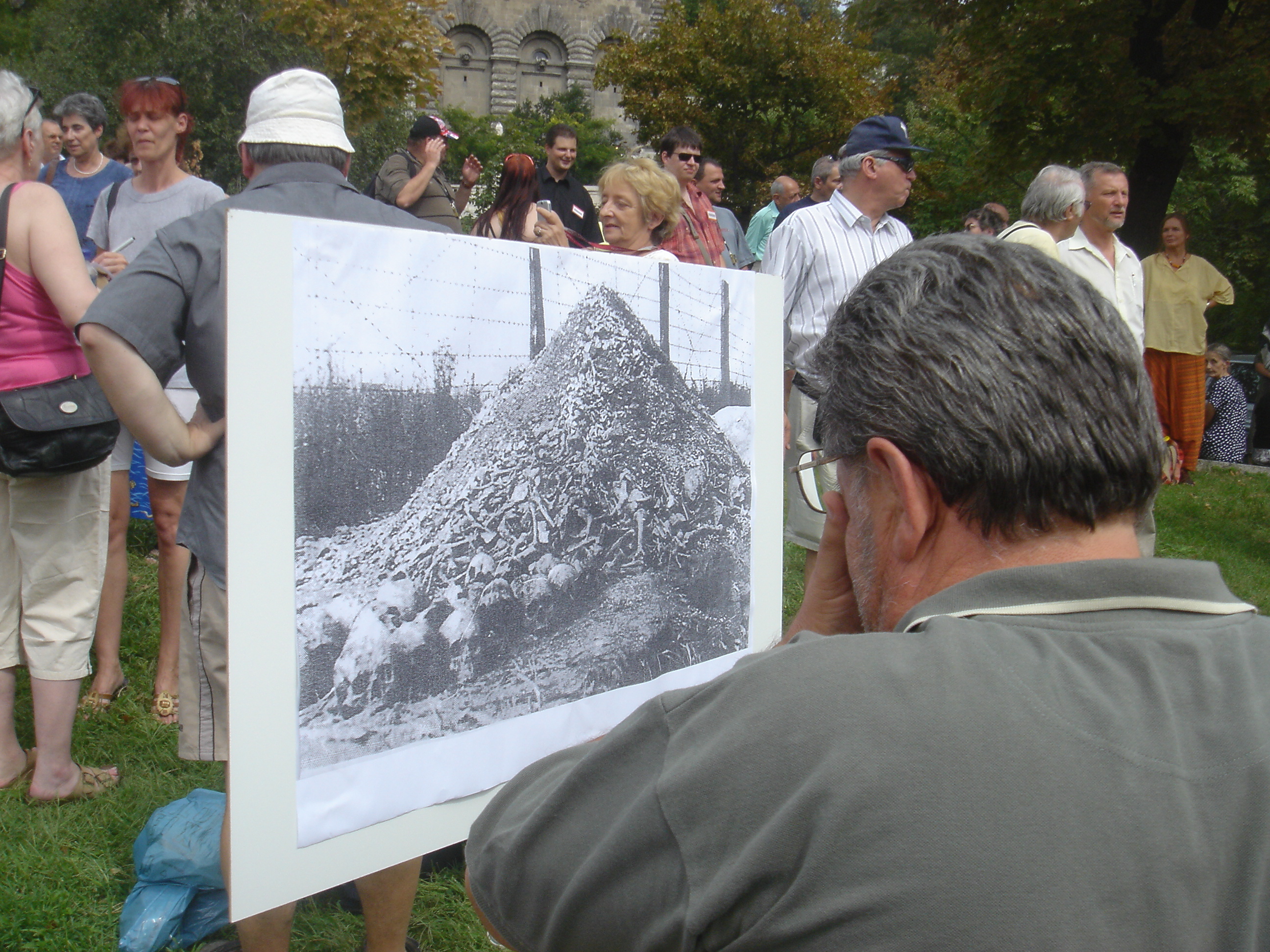 35 January 7, 2015 2592 × 1944 Sign showing piled bones of Nazi concentration-camp victims at anti-Hungarian Guard demonstration (8/25/2007).