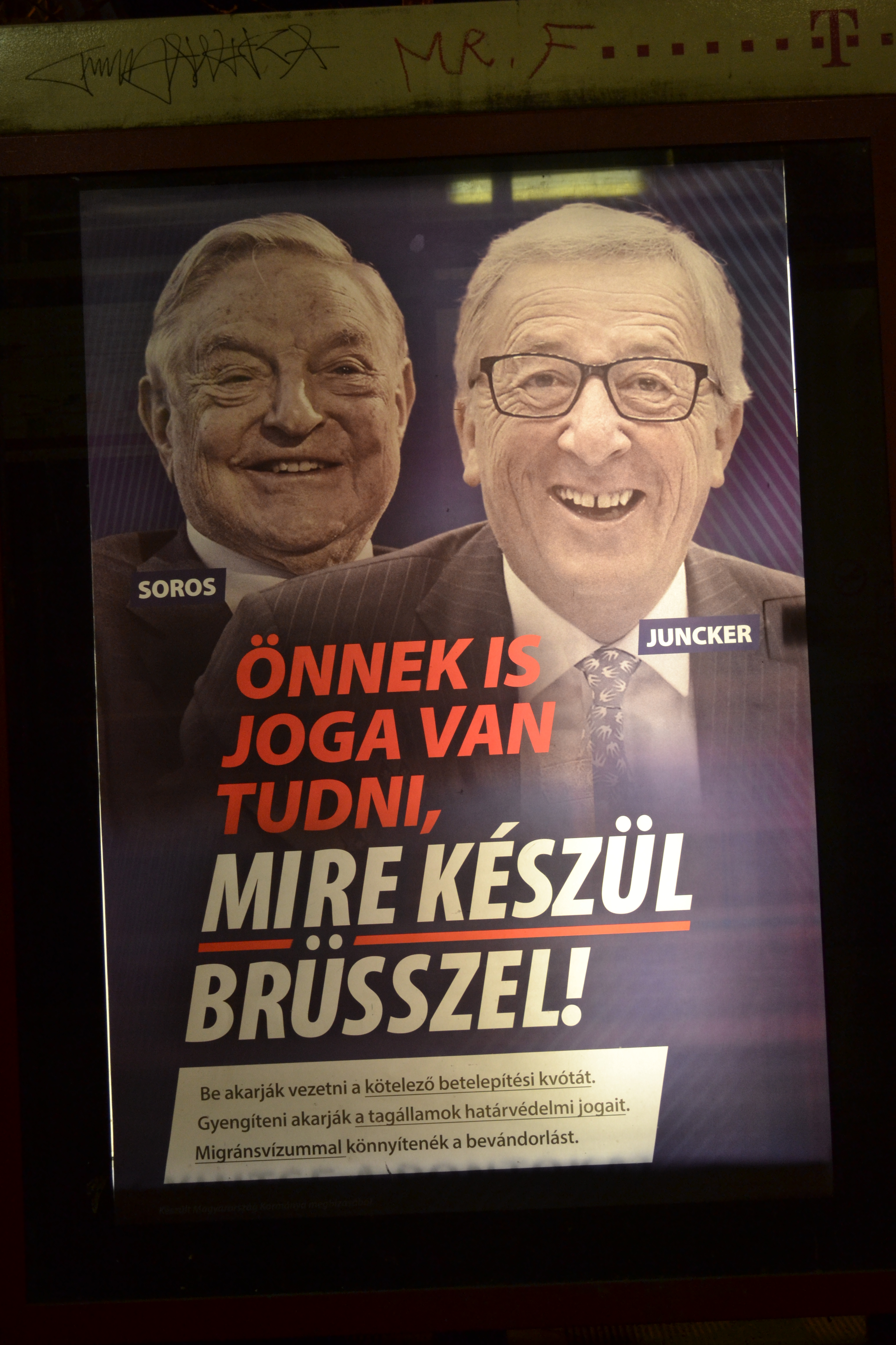 A few days later, signs showing unflattering images of György/George Soros and European Commission President Jean-Claude Juncker alongside the text “You Also Have the Right to Know What Brussels Is Preparing to Do!” (Önnek is joga van tudni, mire készül Brüsszel!) appeared in large number on the streets of Budapest.
