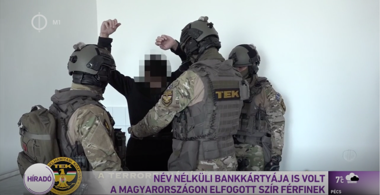 Newscaster (0:54): The court has ordered the arrest of the 27-year-old man who according to the suspicion [of authorities] was one of the leaders of the Islamic State in Syria a few years ago and organized suicide missions and directed executions. He came to Europe with the immigrants in 2016 and was caught at Ferihegy airport [Budapest Ferenc Liszt International Airport] last December during an identity check.