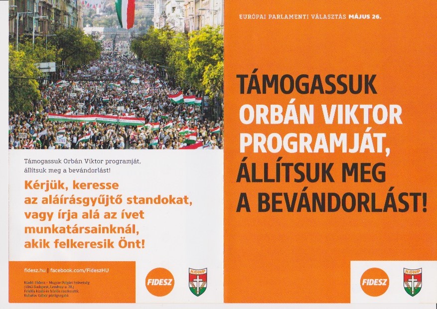 The government of Prime Minister Viktor Orbán conducted intensive propaganda in preparation for the Fidesz–Christian Democratic People’s Party (KDNP) campaign for the May 23–26 European Parliament (EP) election. The slogan of the propaganda campaign was “For us, Hungary is first!” (Nekünk Magyarország az első!).