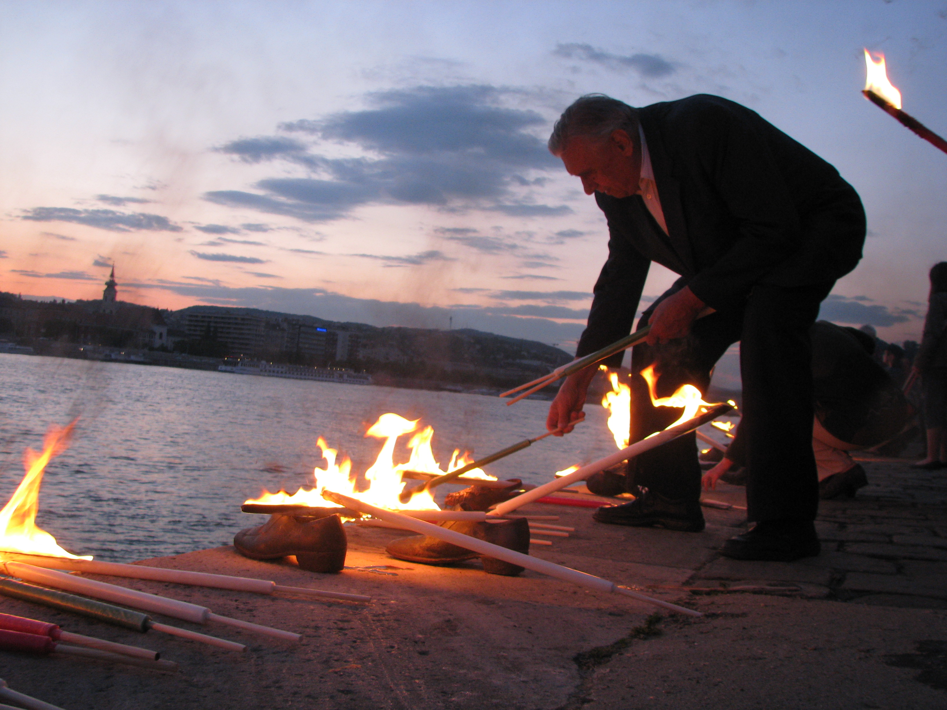 61 January 7, 2015 3264 × 2448 Man lights torch at Shoes on the Danube Bank Hungarian Holocaust Memorial (5/9/2008),