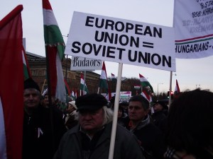 -Inscription on Lead Banner: “Those Who Are Aggressive Are Frightened. We Are Not Frightened!” (Aki Agresszív Fél. Mi Nem Félünk!) (reference to the toppling during an opposition demonstration of a model replica of the Stalin statue pulled down at the start of the 1956 Hungarian Revolution, though with facial features matching those of Prime Minister Orbán. See Testament to Weakness).