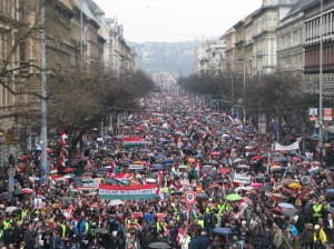 Supporters of Prime Minister Viktor Orbán have organized seven pro-government Peace March (Békemenet) demonstrations, six in Budapest and one in the city of Gyula in southeastern Hungary, since January 2012. Between around 100,000 and 450,000 people have participated in the six Peace March processions in Budapest, making them the largest organized political demonstrations to take place in Hungary since the country’s transition from communism to democracy in 1990.