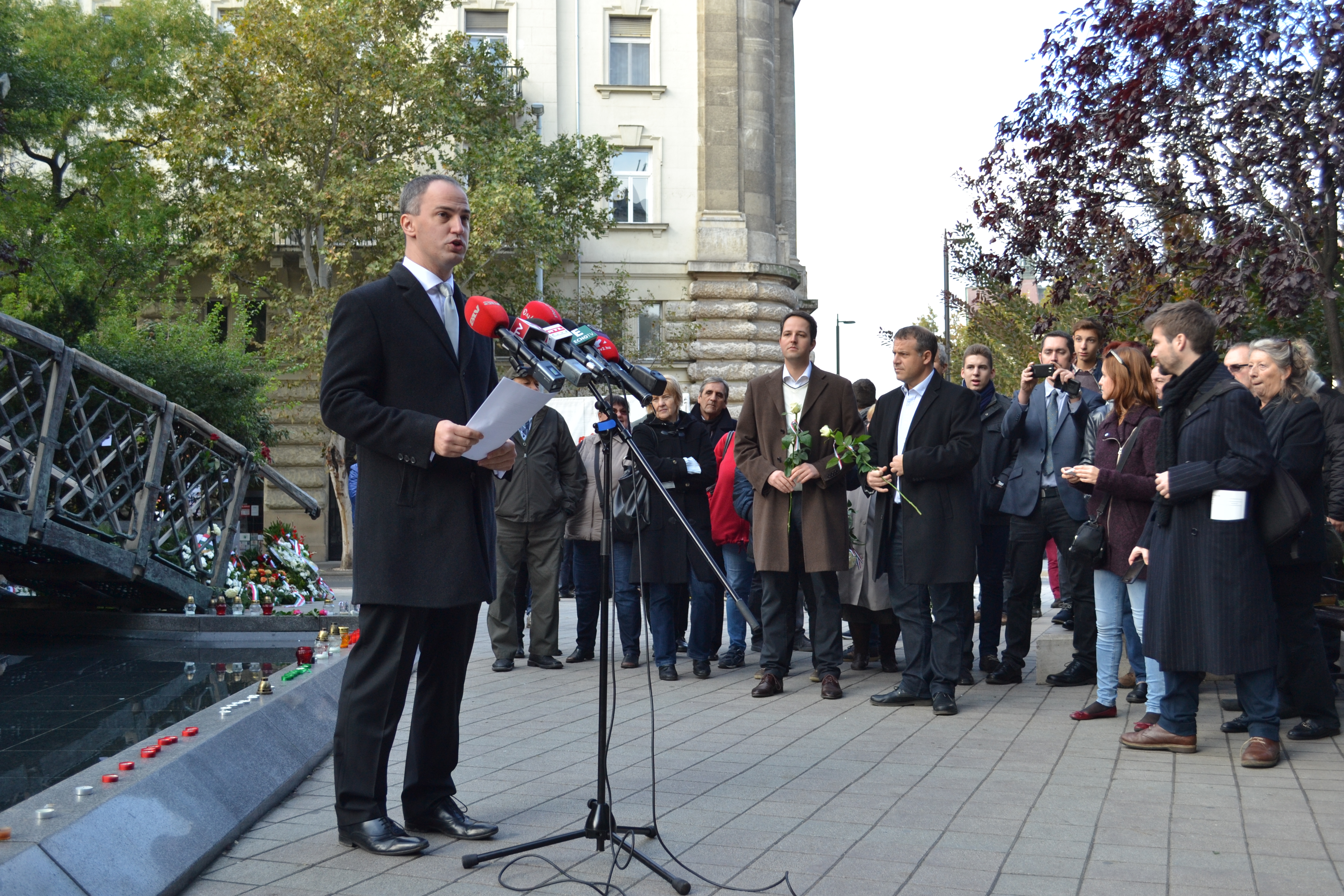 Together party President Viktor Szigetvári spoke before about 30 people, half of them journalists, at the statue of 1956 Hungarian Revolution Prime Minister Imre Nagy. Memorable quote from Szigetvári’s speech: “Freedom is in a bad state in Hungary today. The prime minister is trampling it under foot as he rushes toward the east and feudal oppression . . .”