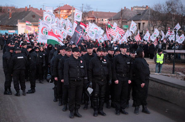Following the weeks of explosive tension between the radical-nationalist paramilitaries and local Gypsies in Gyöngyöspata and Hajdúhadház, the Orbán government initiated changes to Hungary’s criminal code aimed at combating what it called “uniformed crime” (egyenruhás bűnözés): these modifications, which the National Assembly approved on May 2, 2011, prescribed prison terms of up to three years for intimidation of others based on their national, ethnic, racial or religious identity and of up to two years for engaging in activities aimed at maintaining public security or public order without lawful authorization (source in Hungarian).