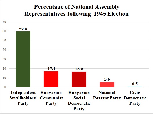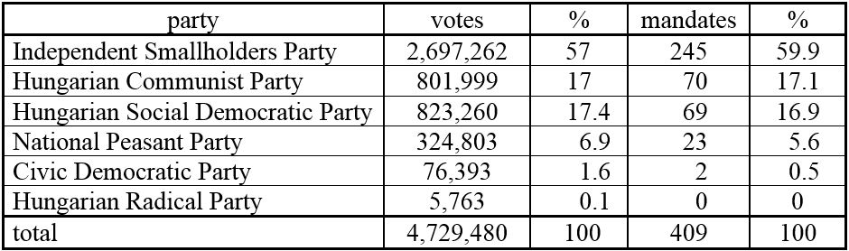 The conservative agrarian Independent Smallholders Party (FKgP) posted an overwhelming victory in these elections, winning slightly under 60 percent of all National Assembly mandates. The Hungarian Communist Party suffered a crushing defeat in the elections, finishing in a virtual tie for second with Hungarian Social Democratic Party with just over 17 percent of all National Assembly mandates.