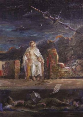 The Second World War October 5, 2013 290 × 406 The Second World War (1939–1945): an Allied bomber swoops down on a family grieving over the corpse of a fallen Hungarian soldier.