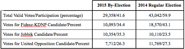 Jobbik candidate Rig received 10,354 of 29,358 votes cast in the April 2015 by-election, while Jobbik candidate Zoltán Dobó received 10,110 of 43,042 votes cast in the regular election one year earlier. Voter participation was 41.6 percent in the by-election, down from 59.9 percent in the regular election.