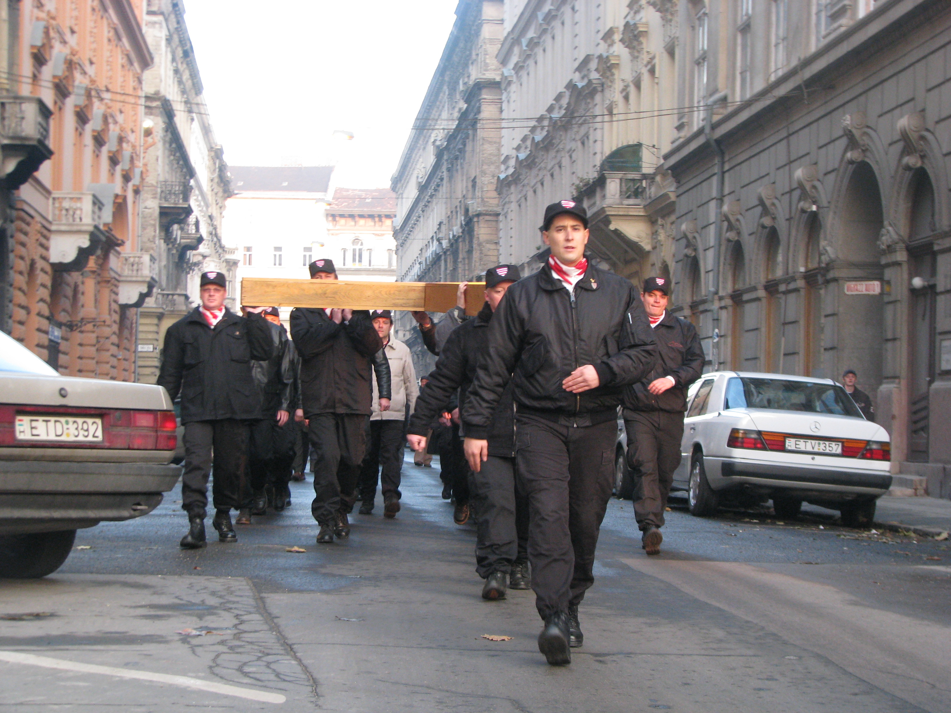 January 7, 2015 3264 × 2448 Members of the Hungarian Guard prepare to erect an Advent cross on a nearby square (12/2/2007).
